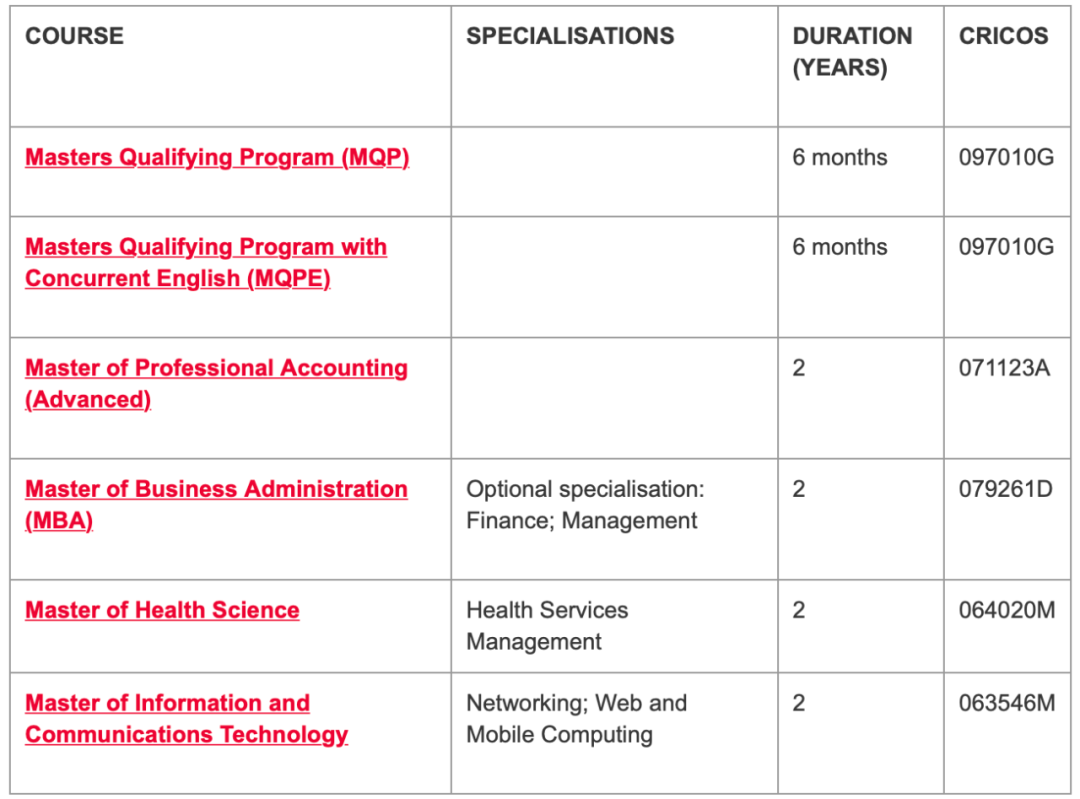 • Master of Information and Communications Technology and Master of Health Science students have a scholarship of $6,000 per year, up to $12,000 in scholarships.