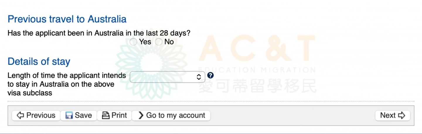選擇過去28天內是否曾在澳洲;以及本次簽證申請預計時長
