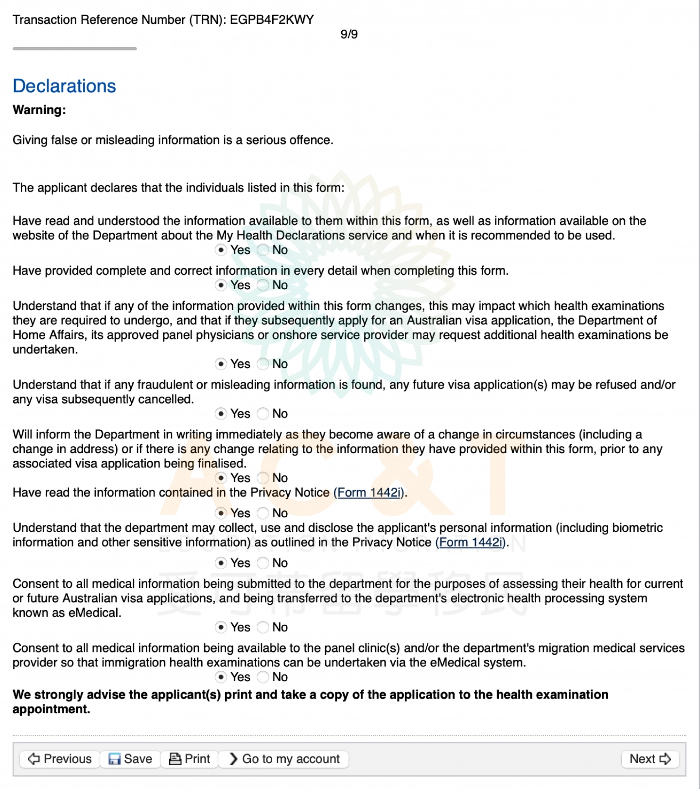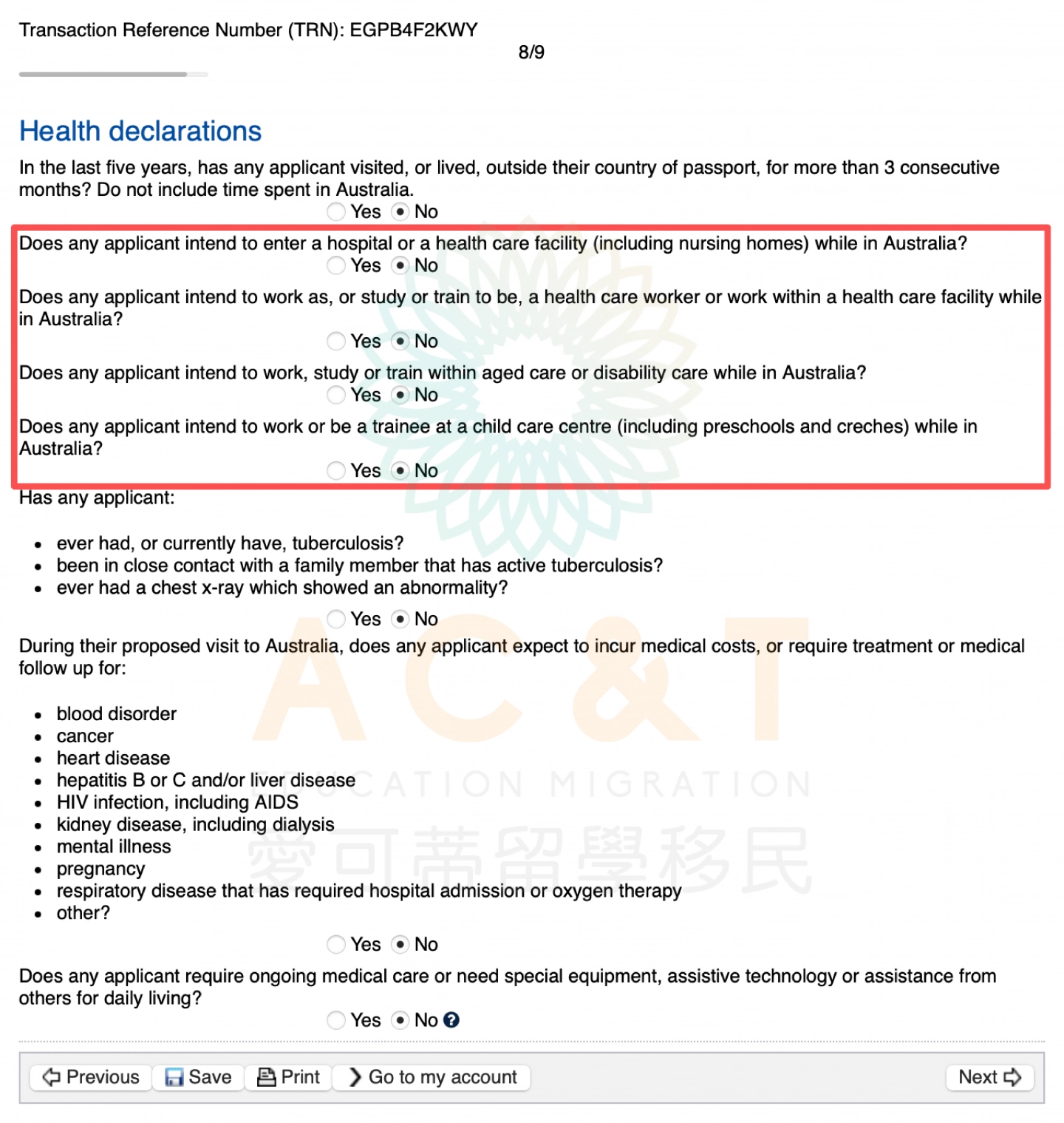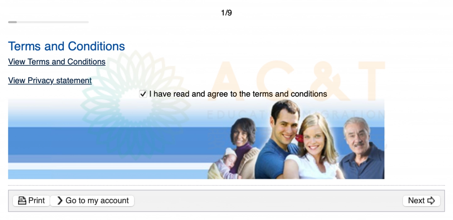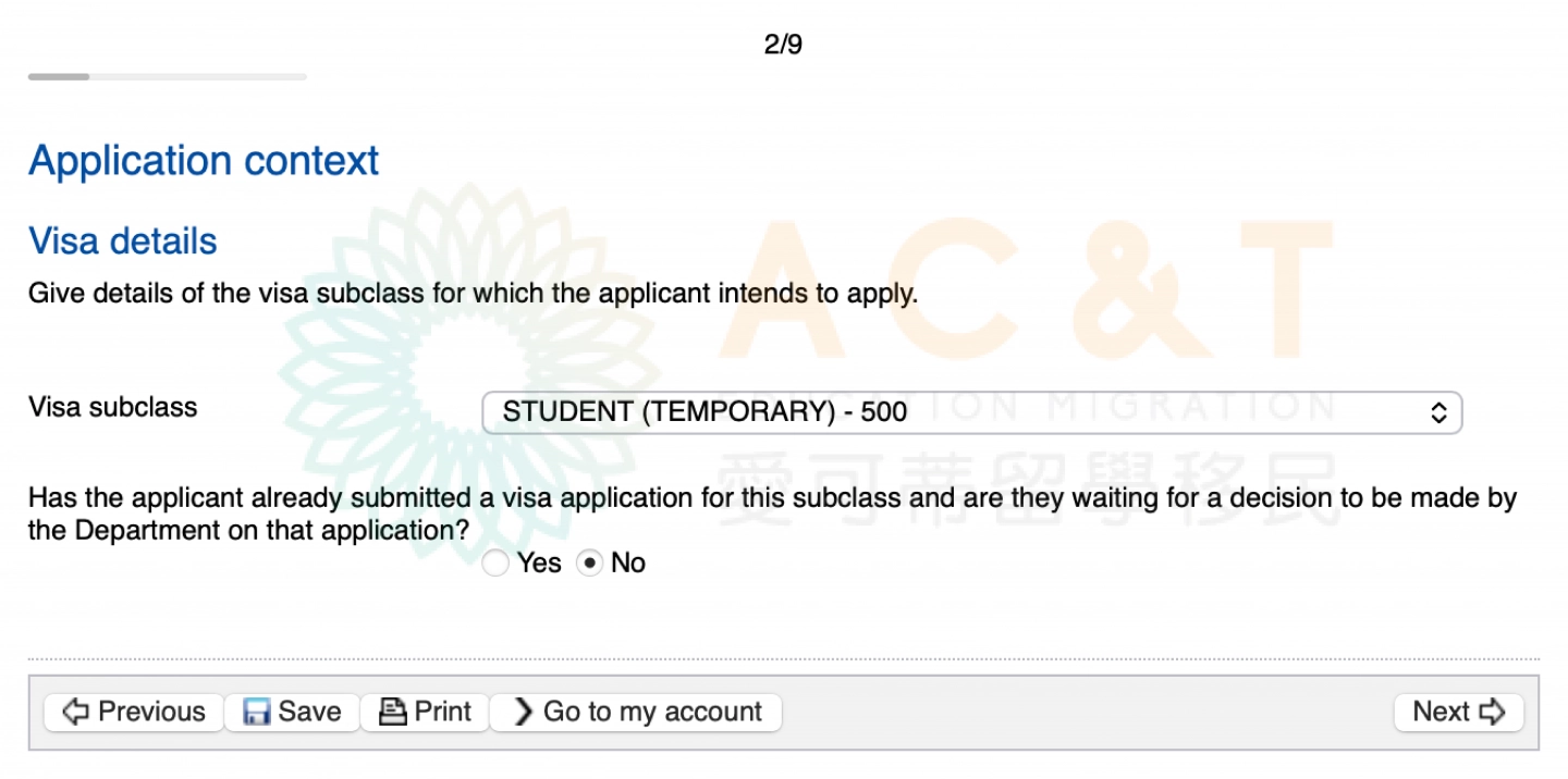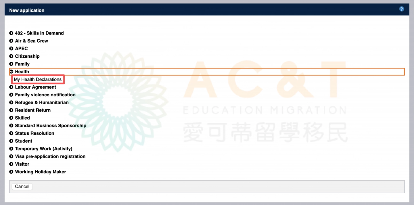 選擇簽證類型以及是否已遞簽:如果已經提交了簽證申請,並正在等待審批結果,無需填寫My Health Declarations