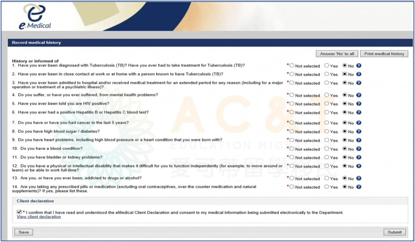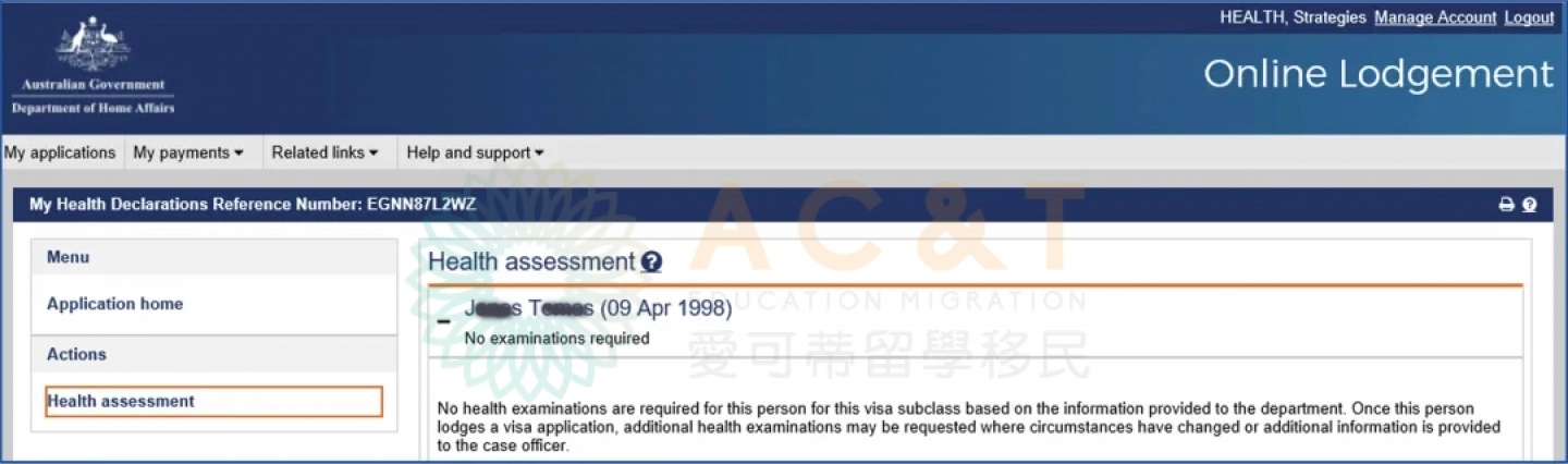 若係統顯示無需體檢No examinations required,說明目前不需要體檢,可以直接遞交簽證申請,但如果後期個人情況有變化,或因先前資訊填寫不準確,移民局仍可能要求補做體檢