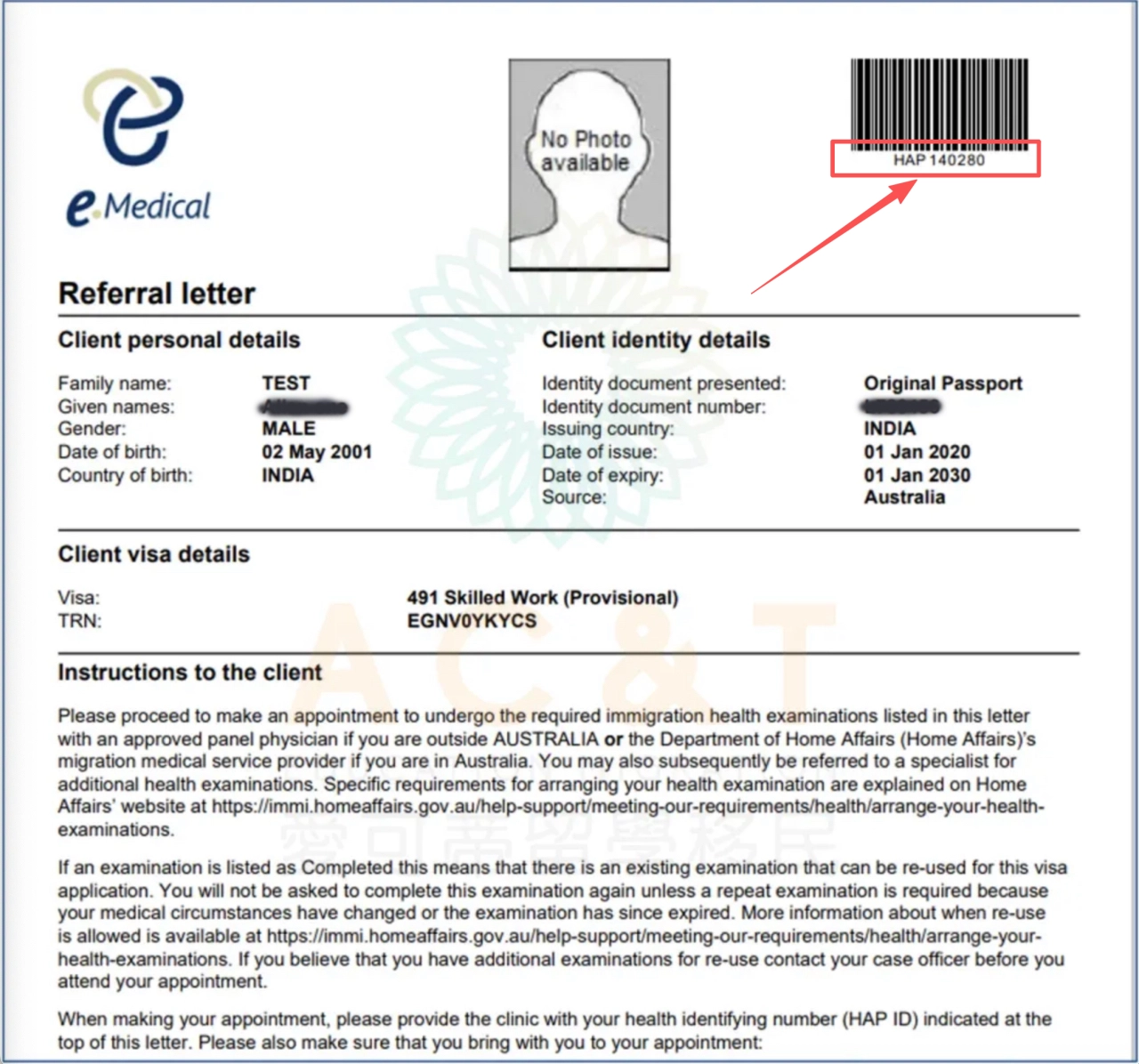 ❗❗體檢推薦信中最重要的資訊是:HAP ID 體檢號碼!之後預約體檢和移民局簽證申請表裡都必須提供這個HAP ID體檢號,請務必保存好。