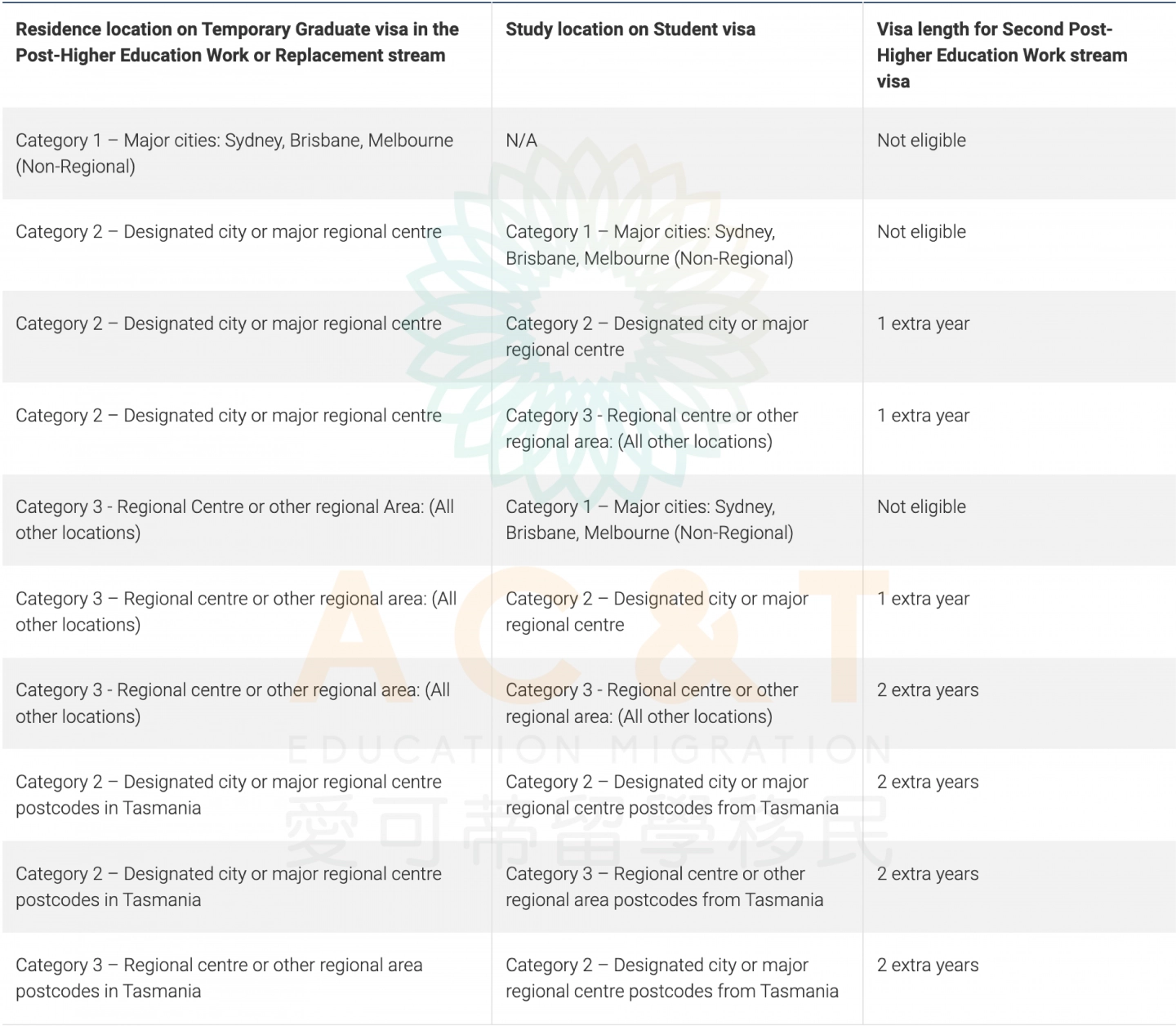 注意:只有學習和生活都在 Category 3 區域,才能申請 2 年續簽,其餘大部分情況為 1 年,詳情請見下圖: