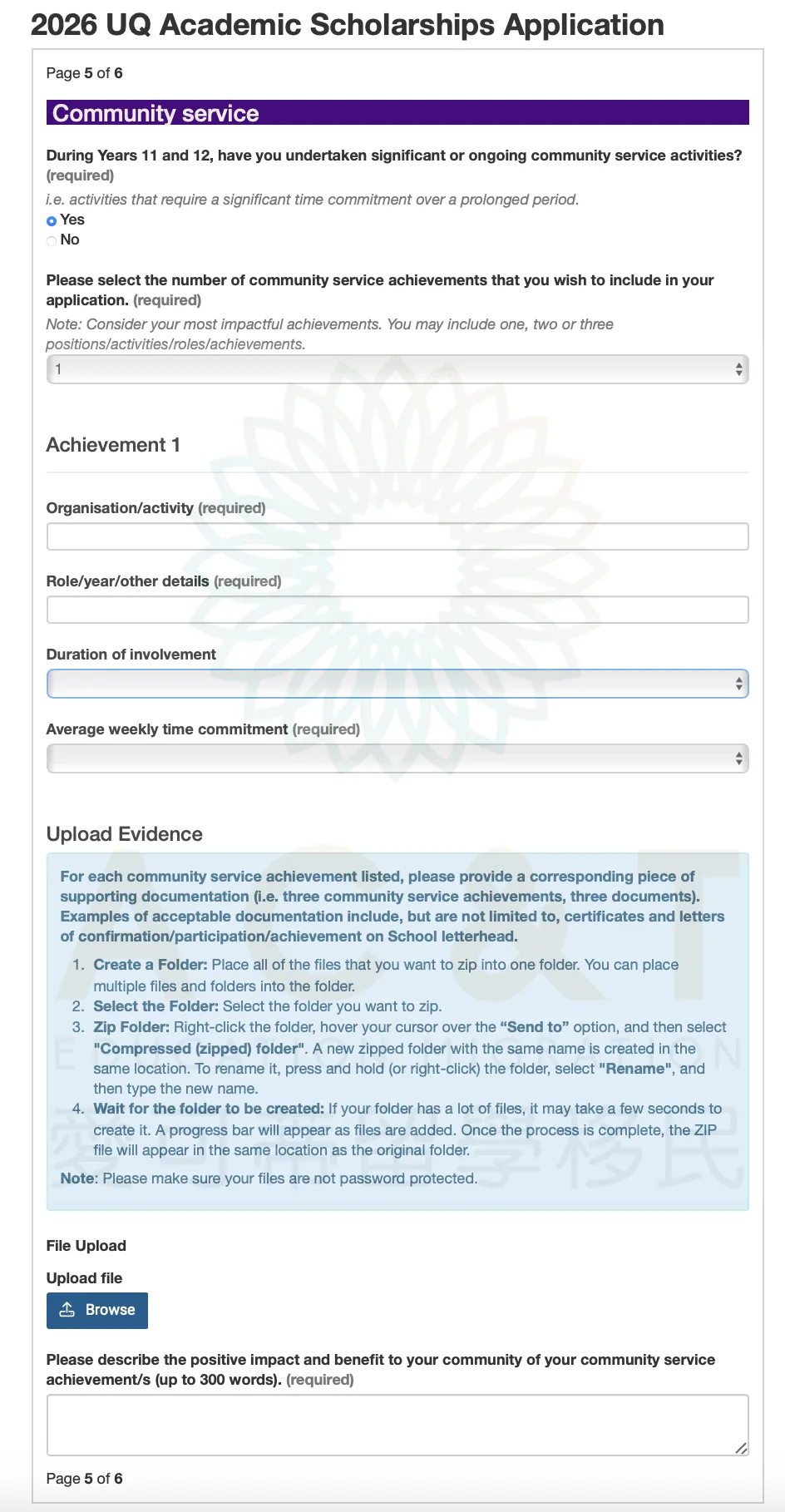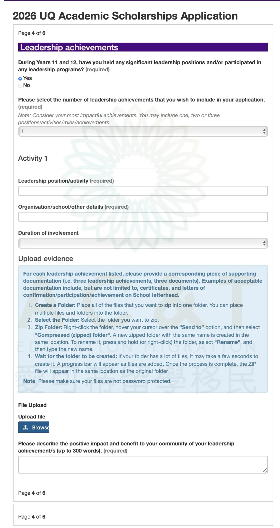 - 提供11-12年級期間參與的能體現領導能力、社區服務活動的相關證明。申請表問題範本請見下圖: