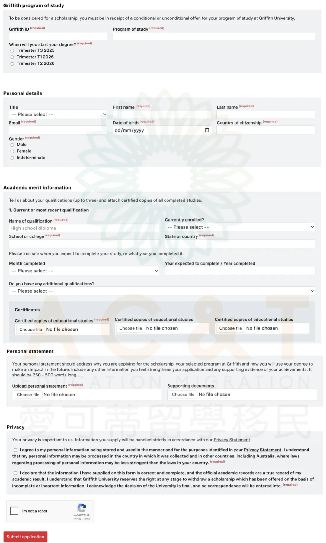 申請方式:國際學生請聯絡愛可蒂遞交學校申請,取得格里菲斯大學學號後,填寫獎學金申請表👇