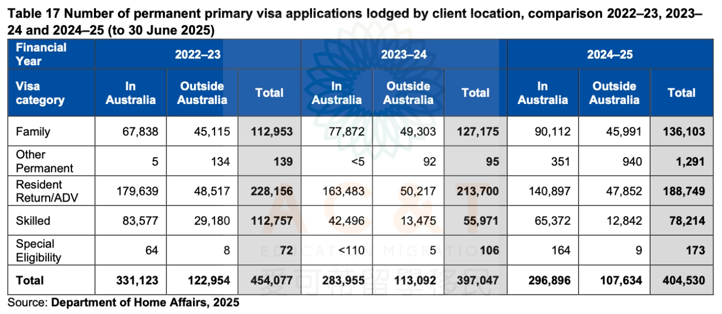 2024-2025財年,在澳洲境外提交的申請數量佔總申請永久技術移民計畫為總數量的26.1%,而2023-2024年度該比例為35.6%。