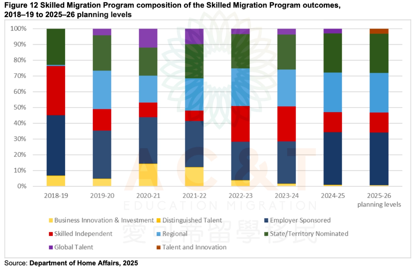 下圖展示了澳洲技術移民計畫在2018–19至2025–26年規劃水準期間,不同簽證類別在整體移民簽證中的組成比例變化: