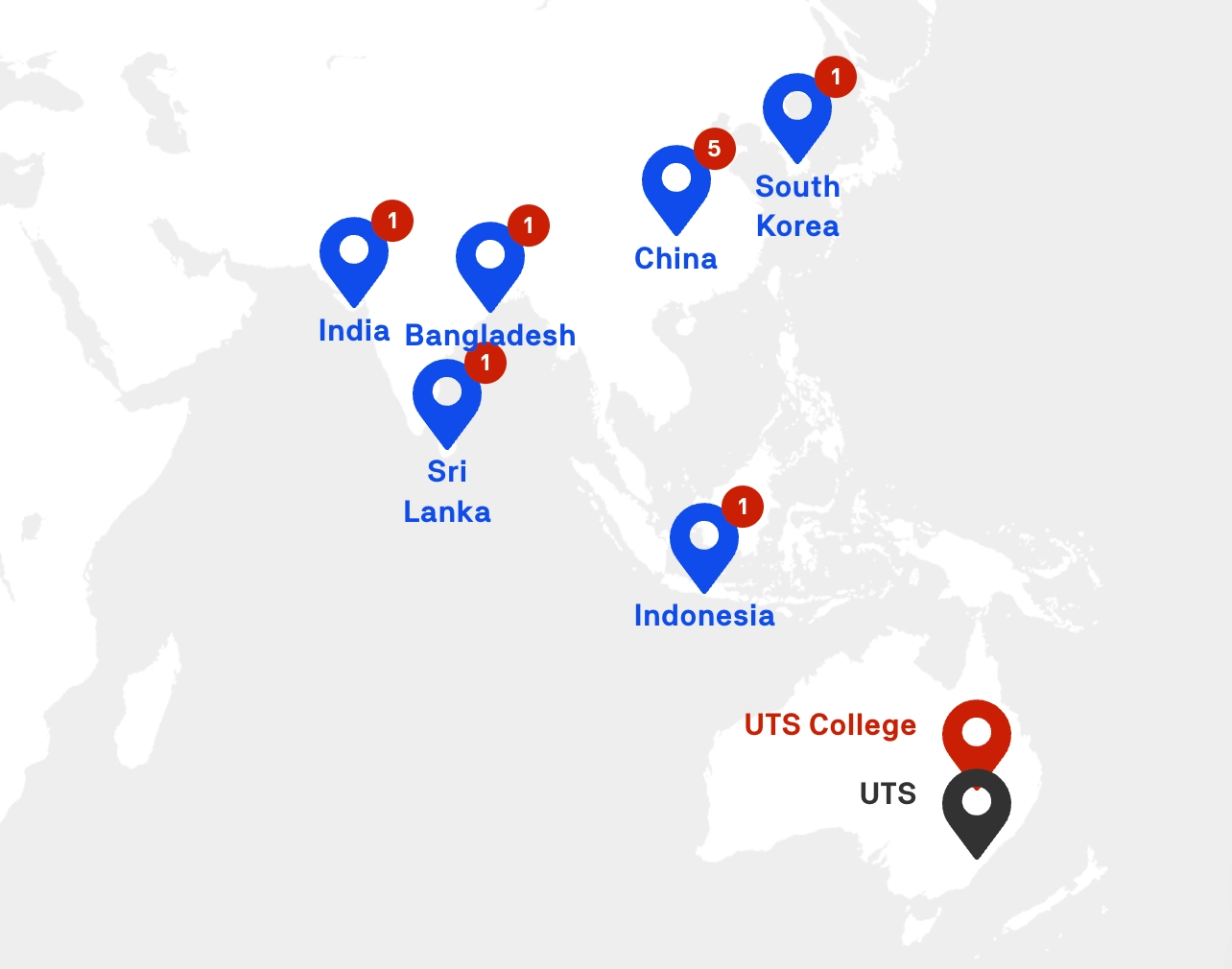 UTS College 的校園遍佈七個國家:澳洲、中國、印尼、南韓、斯里蘭卡、孟加拉和印度,學生可以在自己的國家完成第一年的英語和學術銜接課程,然後繼續在UTS College 或 UTS 學習。