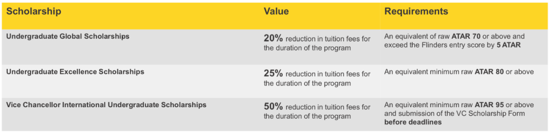 本科獎學金分為Undergraduate Global Scholarships, Undergraduate Excellence Scholarships和Vice Chancellor International Undergraduate Scholarships,分別有20%, 25%和50%的學費減免,評估標準為12年級學生的ATAR成績,詳見下圖: