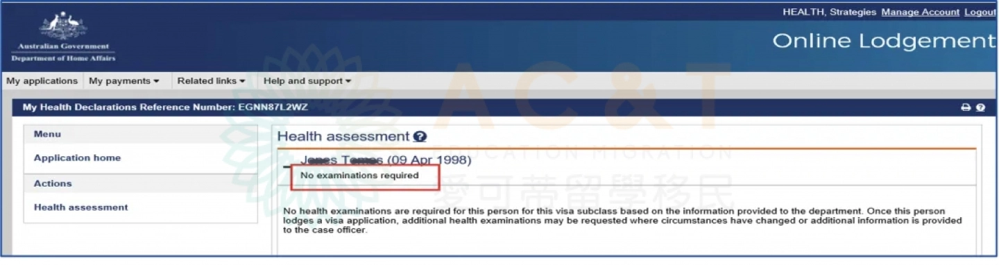 若係統顯示無需體檢No examinations required,說明目前不需要體檢,可以直接遞交簽證申請,但如果後期個人情況有變化,或因先前資訊填寫不準確,移民局仍可能要求補做體檢