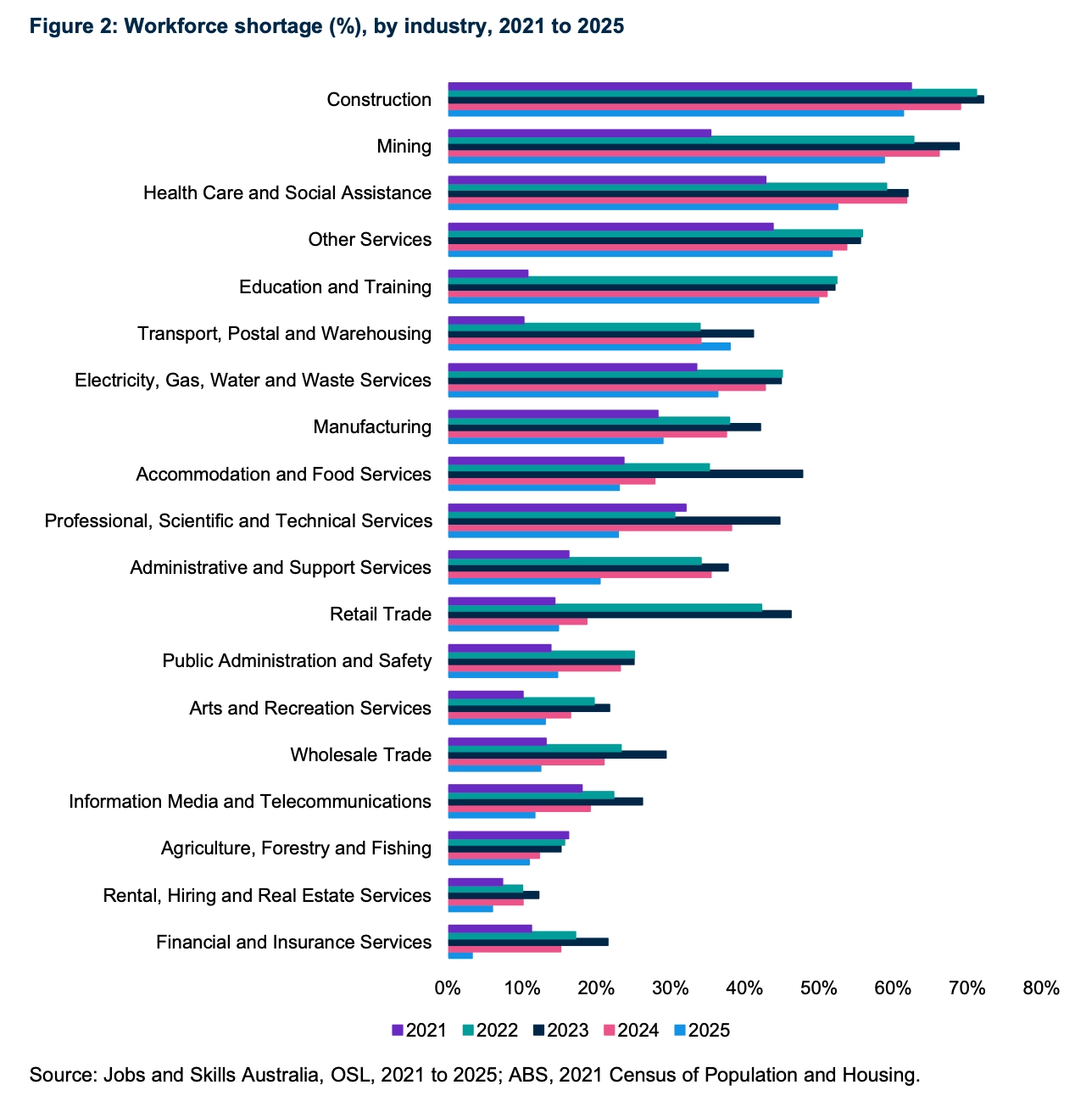 報告也顯示,澳洲近年來面臨職業短缺壓力最大的一些行業包括:建築業、礦業、醫療與社會援助、其他服務業、教育與培訓業的勞動力短缺比例最高。